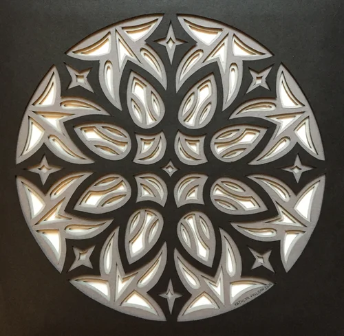 hand-cut, folded, and layered paper with colored pencil, 9" x 9"